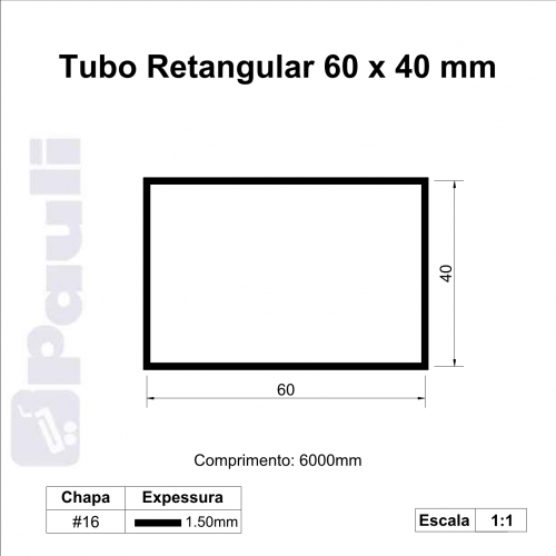 Também conhecido como "Metalon" ou "Metalão", o Tubo Retangular 60 x 40 mm #16 (1.50 mm) é utilizado para diversos fins, por exemplo, a fabricação de portões e grades.
